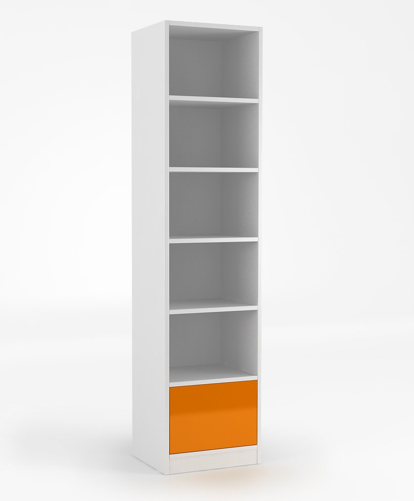 • regał 50 ma 1 szufladę z systemem TIP – ON firmy BLUM, czyli otwieranie przez naciśnięcie. W celu otwarcia frontu bez uchwytu, wystarczy delikatnie nacisnąć natomiast, aby go zamknąć należy lekko docisnąć,